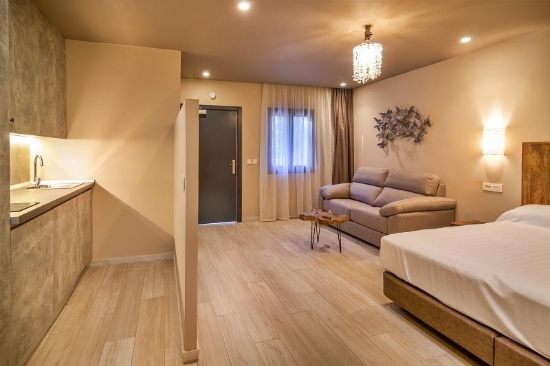 Estudios y apartamentos preparados para el alojamiento de 2 personas, cuentan con salón-dormitorio con cocina integrada y baño independiente. Están equipados con cama doble de 180 cm, televisor de pantalla plana, armario-ropero, cocina americana equipada con horno-microondas, placa de inducción, nevera, lavadora y todo el menaje necesario para la preparación y consumo de alimentos.